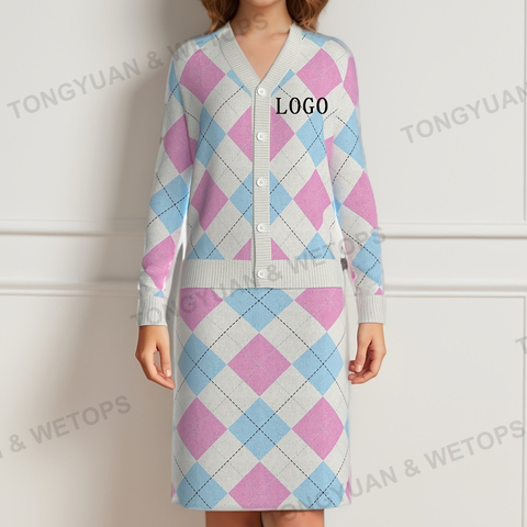 BSCI 사용자 정의 니트 스웨터 대형 가을 겨울 2024 새로운 디자인 패션 격자 무늬 그리스 스웨터 랩 엉덩이 스커트 세트 여성용